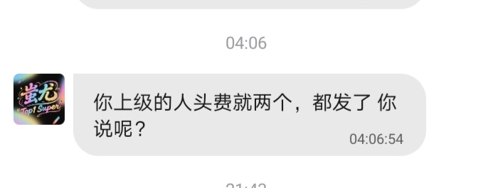 我加了一个旺旺群top1的,找他打人头费,到时间问他说我的账号活跃度不够,没有,我不相信,去找管理问,他说我上级的人头费都发了,然后又找他,他说等会给我补,然后就把我删除了,请各位兄弟,别相信旺旺群的人!